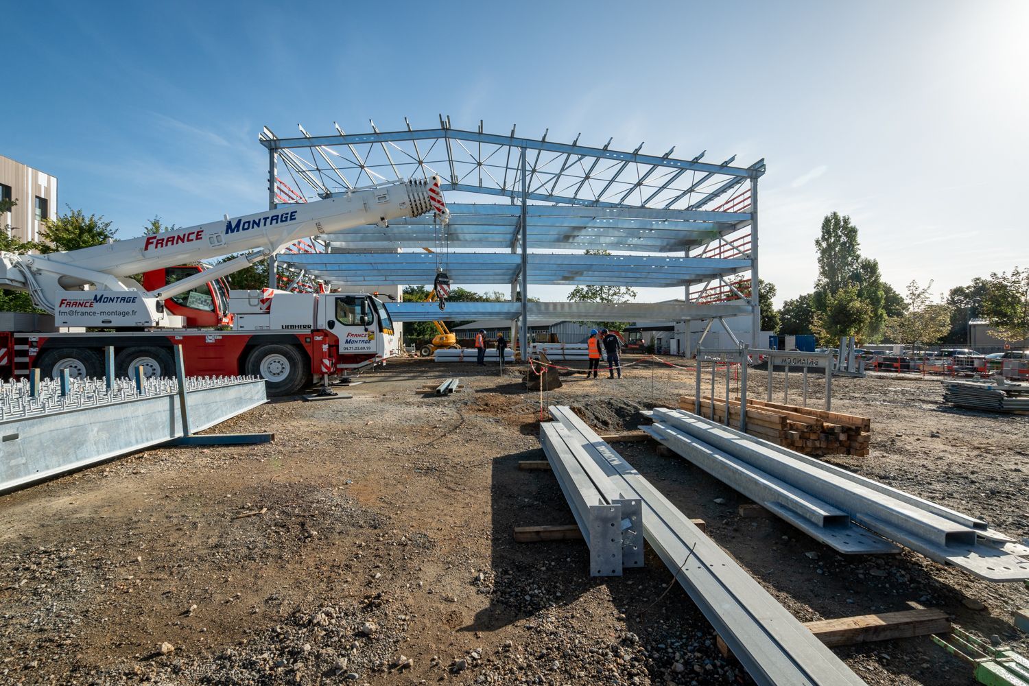 Le chantier avance : le terrassement, le bassin de rétention et les fondations sont achevés. L’élévation des circulations verticales piétonnes et le montage de la structure métallique sont en cours.