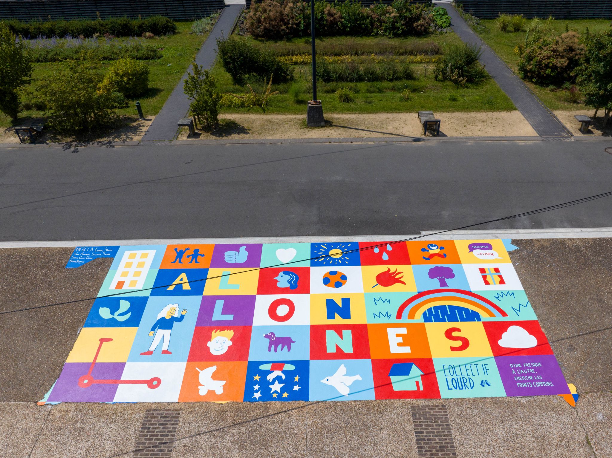 Le Collectif Lourd a, quant à lui, réalisé deux fresques au sol, « Jeux cherche et trouve », sous forme de damier. Un jeu visuel invite les curieux à explorer et à retrouver les éléments cachés qui se répondent d’une fresque à l’autre. 🔍